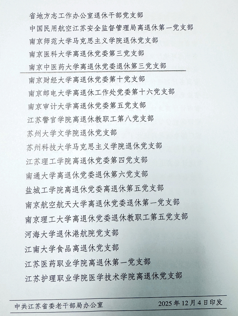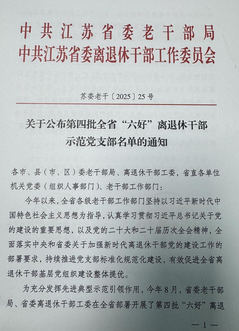 近日,中共江苏省委老干部局、省委离退休干部工作委员会下发《关于公布第四批全省“六好”离退休干部示范党支部的通知》(苏委老干〔2025〕25号),我校退休第三党支部光荣上榜,荣获全省“六好”离退休干部示范党支部称号。