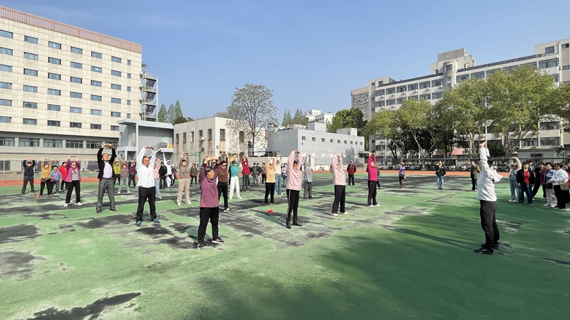 活动当日,天气晴好,校园内草木葱茏,繁花似锦。老同志们早早来到集合点,久别重逢的喜悦洋溢在脸上。健步走前,徐勰老师带领大家打八段锦。伴着舒缓音乐,老同志们凝神静气、舒展身姿,一招一式刚柔并济,为健步走做好热身。